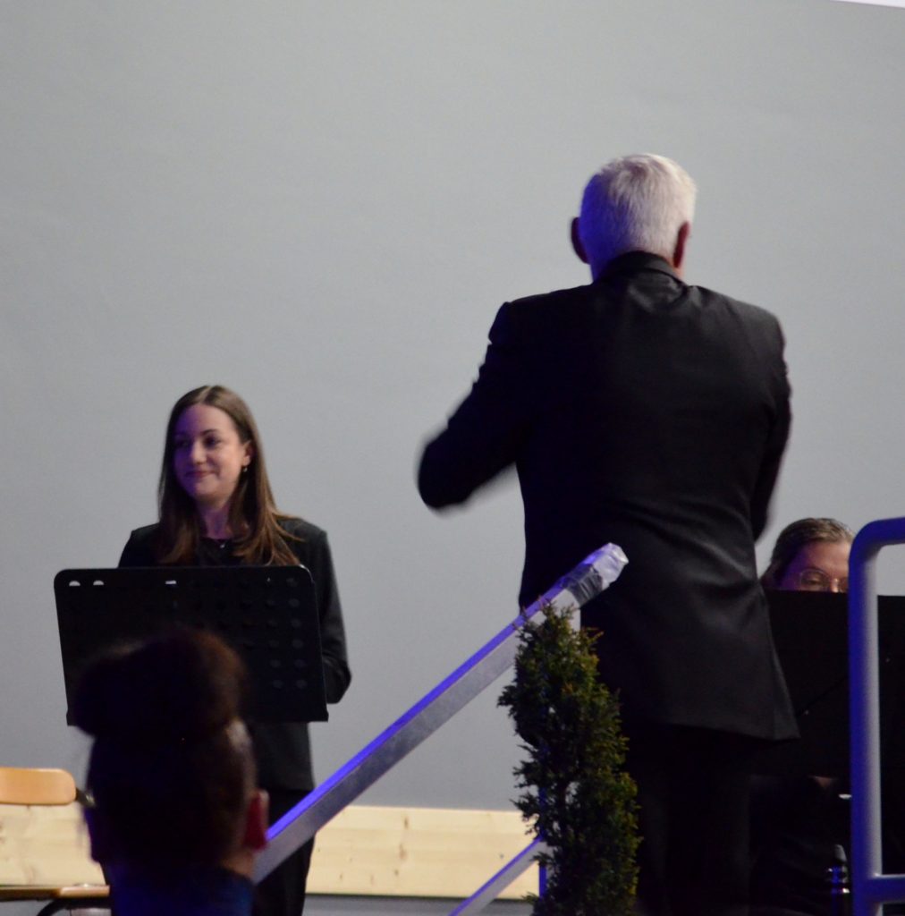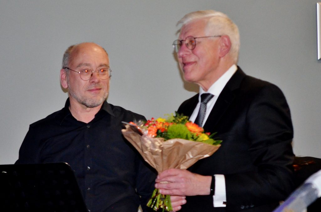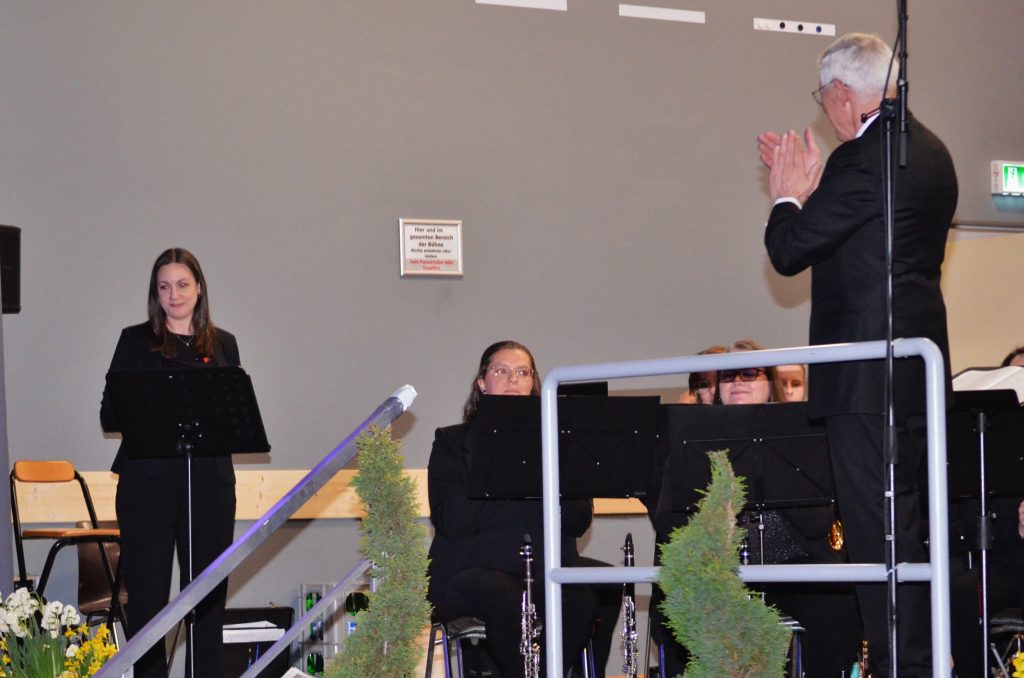 An erster Stelle dankte er allen Musizierenden für die geopferten Stunden der Vorbereitung und natürlich deren Familien für die Unterstützung. Ein besonderer Dank ging an den neuen Dirigenten Georg Landmesser, der „die Musiker mit viel Feingefühl und Motivation auf diesen Tag vorbereitet hat“. Herr Hildebrand überreichte ihm einen Blumenstrauß. Ebenfalls dankte er Anja Schulz, „die mit ihrer klangvollen Stimme unser Konzert bereichert hat!