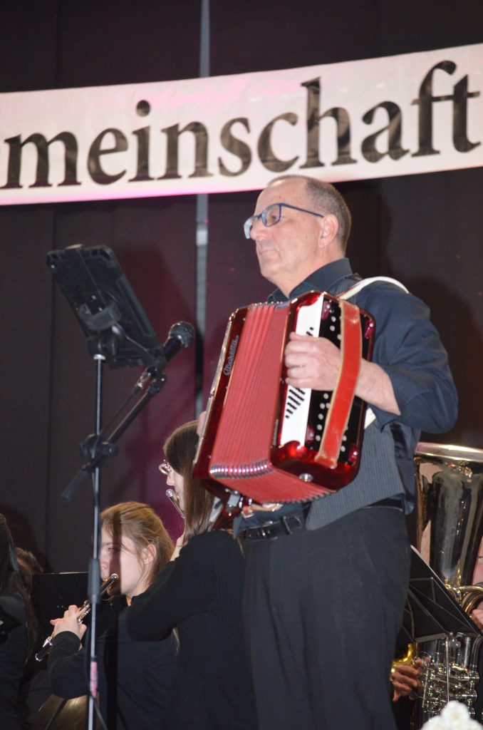 Helmut Geiser, der normalerweise Querflöte spielt, griff bei diesem Stück zum Akkordeon. Er ist ein wahrer Vollblut-Musiker, so Guido Hildebrand, denn beim Konzert hat er bei fast allen Stücken die Percussion-Stimme, das Glockenspiel, mal das Keyboard, die Kuhglocke, das Becken, das Tamburin oder eben das Akkordeon gespielt.